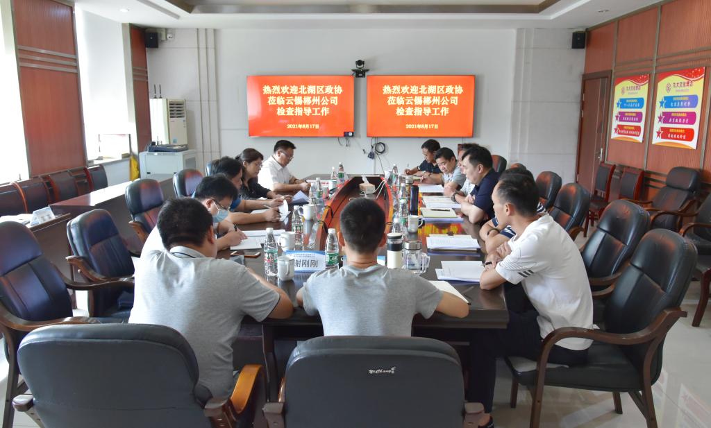 8月17日,郴州市北湖區政協主席黃晨峰率隊調研云錫郴州公司,深入了解郴州公司當前生產經營情況和下一步錫產業轉型升級的工作規劃。