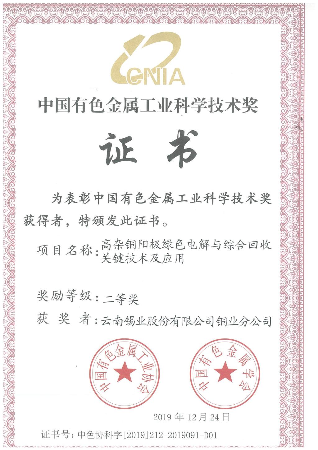 近日,銅業(yè)分公司收到中國有色金屬工業(yè)協(xié)會(huì)頒發(fā)的榮譽(yù)證書,銅業(yè)分公司申報(bào)的《高雜銅陽極綠色電解與綜合回收關(guān)鍵技術(shù)及應(yīng)用》榮獲中國有色金屬工業(yè)科技進(jìn)步二等獎(jiǎng)。