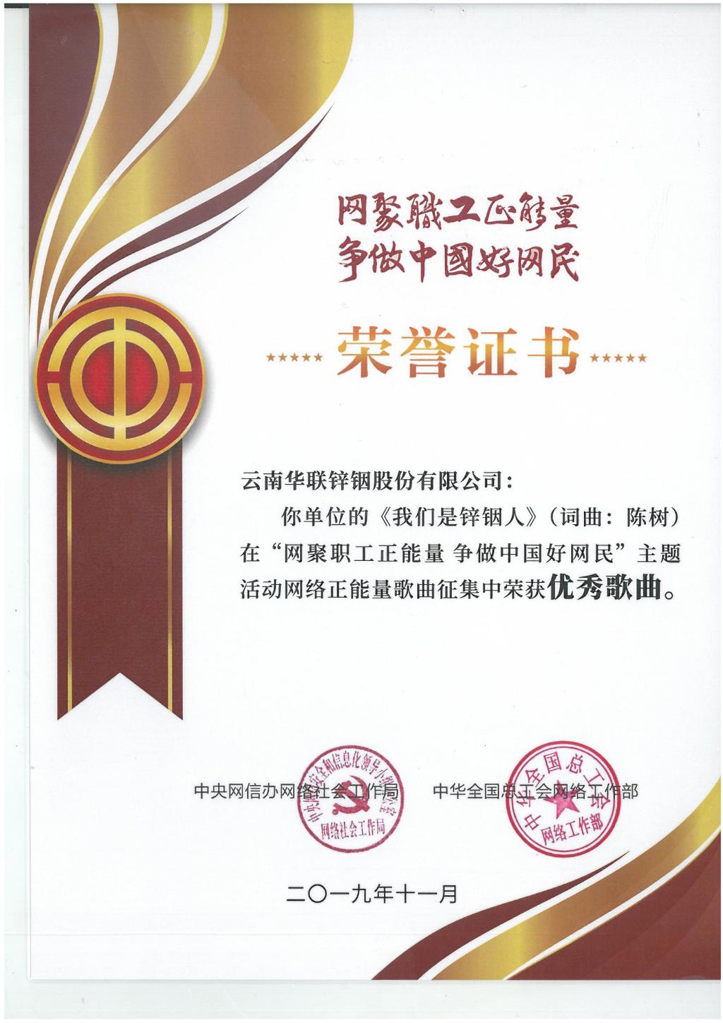 近期,華聯鋅銦公司形象歌曲—《我們是鋅銦人》MV在全國“網聚職工正能量 爭做中國好網民”主題活動網絡正能量歌曲征集中榮獲優秀歌曲。