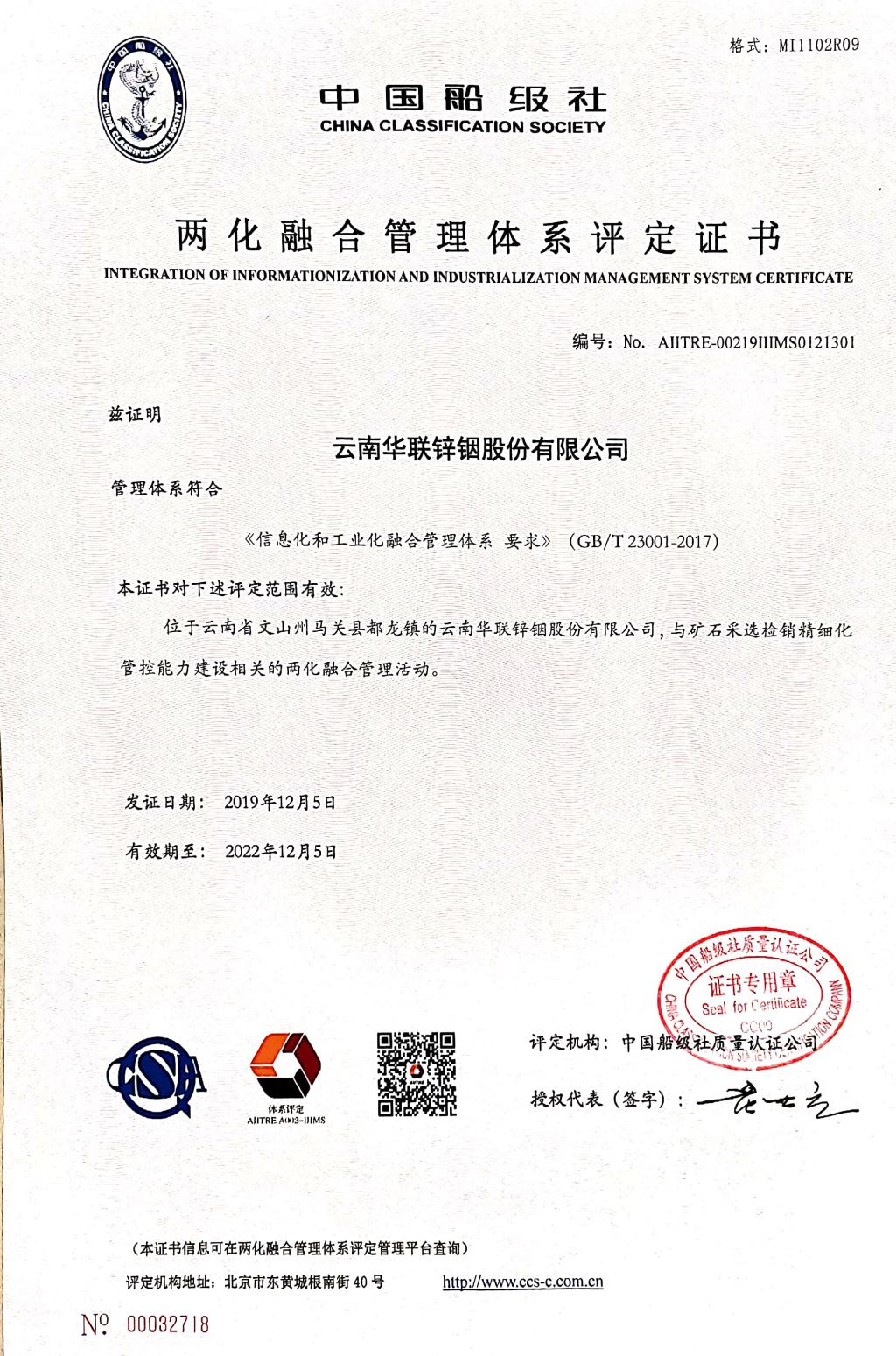 12月5日,華聯鋅銦公司通過交通部直管事業單位中國船級社兩化融合管理體系認證,并頒發“兩化融合管理體系認證證書”,成為文山州第一家通過該項體系認證的成員企業。