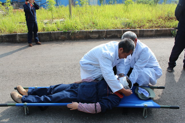 反恐小組趕到出事地點后,警戒保衛(wèi)組立即組織現(xiàn)場無關(guān)人員撤離,同時設(shè)置警戒線。副總指揮何文勇向車內(nèi)的“暴恐分子”喊話,要求他們放棄抵抗,繳械投降,其中一名“暴恐分子”見勢不對,亮出隨身藏匿的刀具挾持人質(zhì)下車準(zhǔn)備逃跑時,被抓捕一組的3名保衛(wèi)人員利用防爆盾牌、防爆叉等工具將其攔阻控制,車內(nèi)剩余兩名“暴恐分子”也隨即被抓捕二組保衛(wèi)人員制服收押,成功解救被挾持的三名職工,并把其中被“暴恐分子”刺傷的一名職工抬到安全區(qū)域由醫(yī)療救護組隊員進(jìn)行現(xiàn)場救治,隨后迅速將傷員轉(zhuǎn)移至醫(yī)院進(jìn)一步救治。