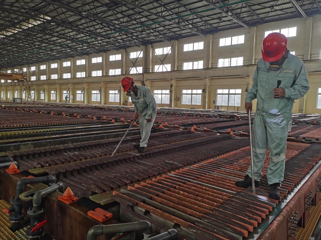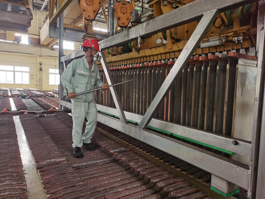 不一會,電解槽面上的工作開始了,遠遠望去,只見他們在槽面上不停地來回走動,手里拿著工具敲打著陽極板。裝槽,需要把槽間銅排沖洗干凈,調整進液管,確保進液管保持在電解槽中心線,再指揮行車工將陽極板吊裝入槽。廠房外外火辣辣的太陽照著,廠房內約38℃的槽面溫度,戴上3M面具,整個人就像“蒸桑拿”,他們手拿工具,當起檢測員,在槽面上對入槽的每一塊陽極板進行認真檢查,間距、相鄰兩陽極板中心距約是否符合要求,用“火眼金睛”排畸,身上的衣服更是濕了干,干了濕,額頭上豆大的汗珠不間斷的往下流。他們來不及休息,為的是第一時間把陽極板入槽,為后續工作爭取時間;他們仔細察看每一塊陽極板狀況,只為能保證產品質量。