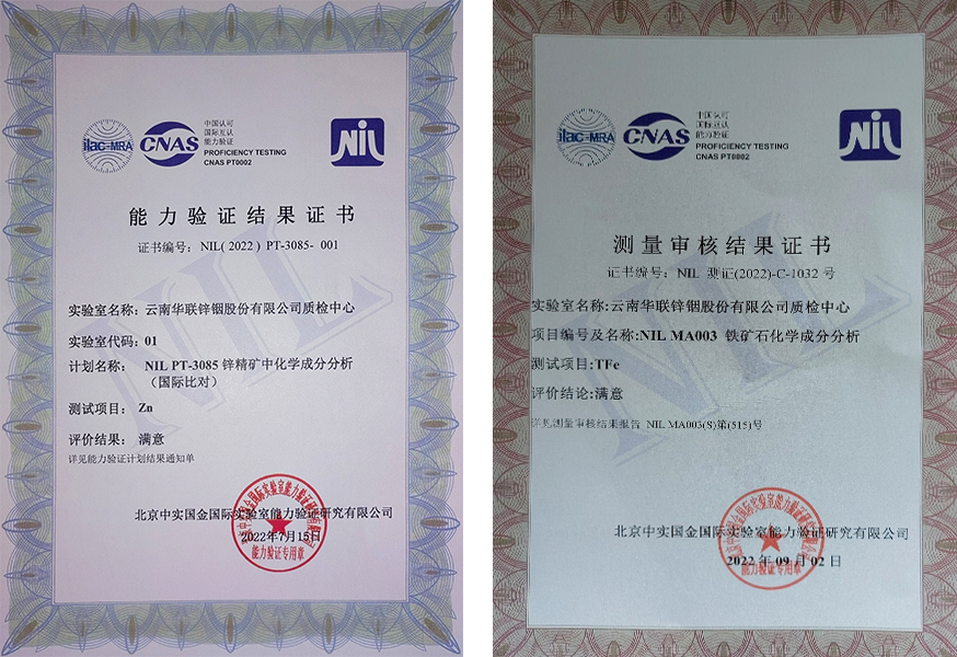 華聯(lián)鋅銦公司質(zhì)檢中心于2022年5月參加北京中實國金實驗室能力驗證研究有限公司申報的國家級實驗室認可領(lǐng)域檢測項目,并順利通過鋅精礦、鐵礦石化學(xué)成分分析國際檢測認可。此次鋅精礦化學(xué)成分分析中Zn能力驗證國際比對,鐵礦石化學(xué)成分分析TFe測量審核,雙雙獲得評價結(jié)果為滿意的證書。