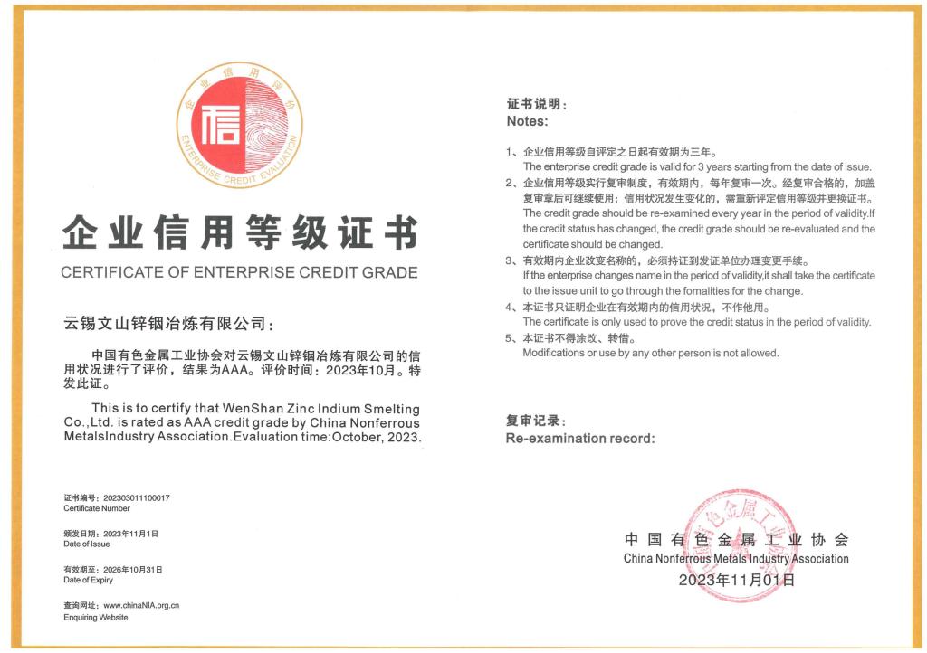 文山鋅銦公司牢固樹立誠信經(jīng)營意識(shí),始終將信用體系建設(shè)放在首要位置,建立健全科學(xué)完善的信用管理體系,強(qiáng)化對上下游客戶的資信管理,全面推行產(chǎn)品質(zhì)量管理,建立并完善生產(chǎn)、銷售、服務(wù)等各個(gè)環(huán)節(jié)的標(biāo)準(zhǔn),為公司在激烈的市場競爭中提供強(qiáng)有力的支撐。曾獲得“國家級(jí)綠色工廠”、“高新技術(shù)企業(yè)”“云南省企業(yè)技術(shù)中心”等多項(xiàng)榮譽(yù),切實(shí)用高質(zhì)量的產(chǎn)品品質(zhì)和服務(wù)詮釋公司實(shí)力。