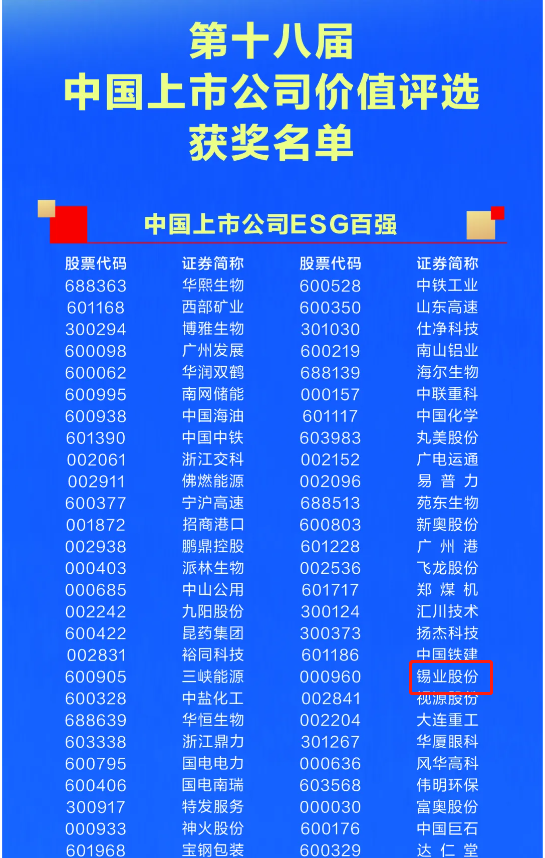 同日,證券時報主辦的“第十八屆中國上市公司價值論壇暨2024新質(zhì)生產(chǎn)力巡禮長三角行”在江蘇昆山舉辦,會議在全面考量上市公司經(jīng)營、財務、創(chuàng)新、市場影響以及社會責任等各方面表現(xiàn)的基礎上評選出了“2024中國上市公司ESG百強”榜單,錫業(yè)股份成功入選。此次榮獲2023年度金信披獎及“2024中國上市公司ESG百強”稱號是公司高質(zhì)量發(fā)展、全方位綜合實力不斷增強的體現(xiàn),更是各界評委對公司規(guī)范運作、信息披露、環(huán)境保護、社會責任履行及公司治理等工作的充分肯定。