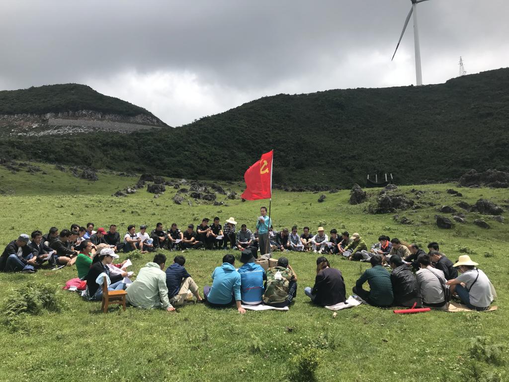 當天,朝陽燃燒著晨霧,清晨的空氣中帶著些許熱意。一坑的60名黨員在黨旗引領下,浩浩蕩蕩向目的地進發,徒步路線從2095老礦區開始到猴子山風力發電站腳,共約15公里。路途中,曾在老礦區待過、年紀稍長的黨員們,指著一處處老舊破敗的建筑向年輕人介紹:“看,那里叫小街子,以前特別熱鬧,人很多”;“那是以前的糧食局”;“以前我們家就在炮臺旁邊的那幢房子里”……這就是老礦山人曾經生產和生活過的地方,隨著資源的消失、生產中段不斷下降,老礦區已逐漸衰落蕭條;曾經熱鬧熙攘的小街子、電影院、糧食局現在已無生氣,漸漸被人們遺忘。年輕黨員們看到這些景象,聽著前輩們講述曾經打拼的故事,紛紛表示要傳承好老一輩礦山人艱苦奮斗的精神,珍惜大好機遇和礦產資源,為大屯錫礦的建設發展不懈努力。