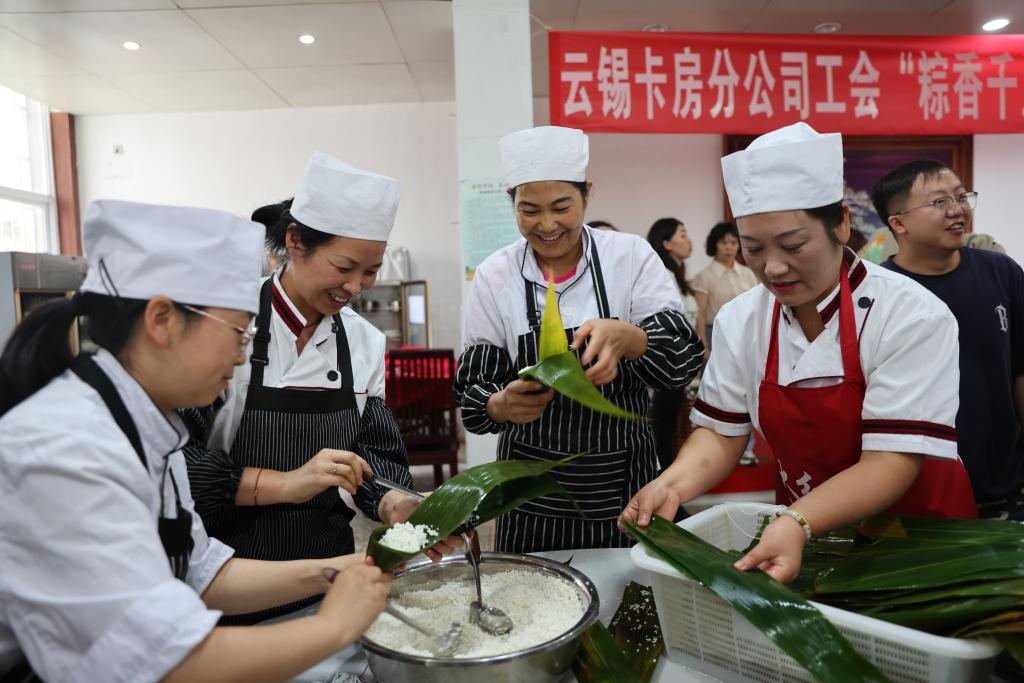 卡房分公司開展“粽香千里 情系卡房”端午節比賽活動。隨著計時口令的發出,大家雙手靈巧地舞動著,將糯米、粽葉巧妙地組合成一個個精致的粽子,在一場充滿激情的無聲較量中增進交流互動。