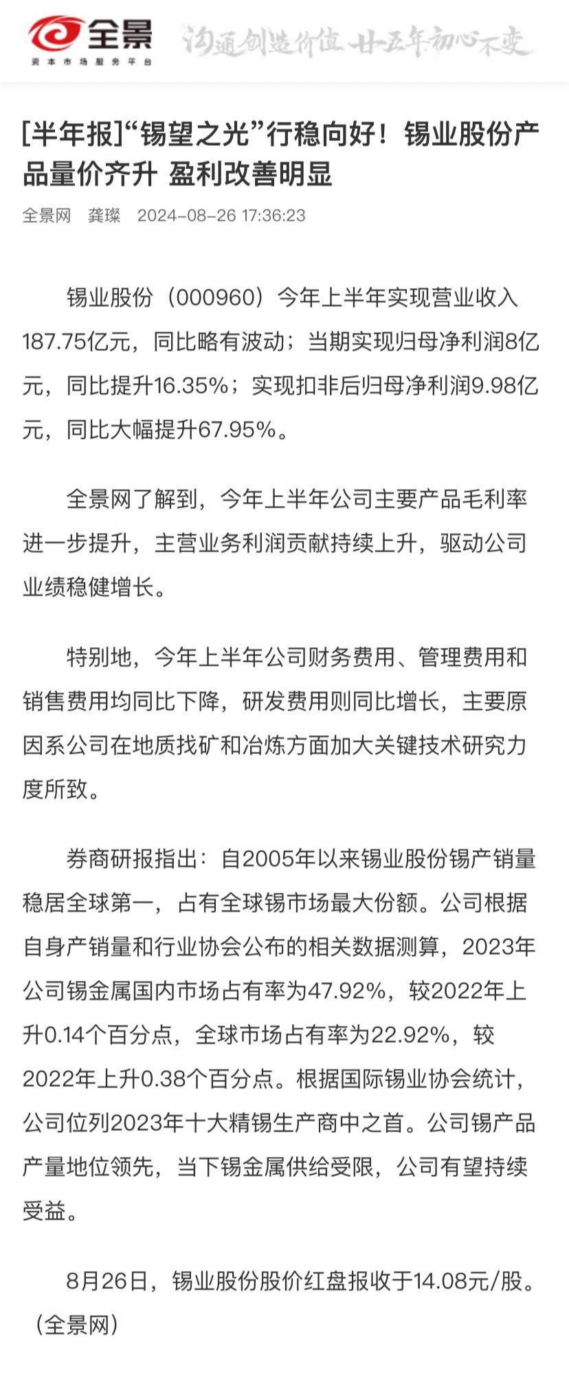 全景網:[半年報]“錫望之光”行穩向好!錫業股份產品量價齊升 盈利改善明顯